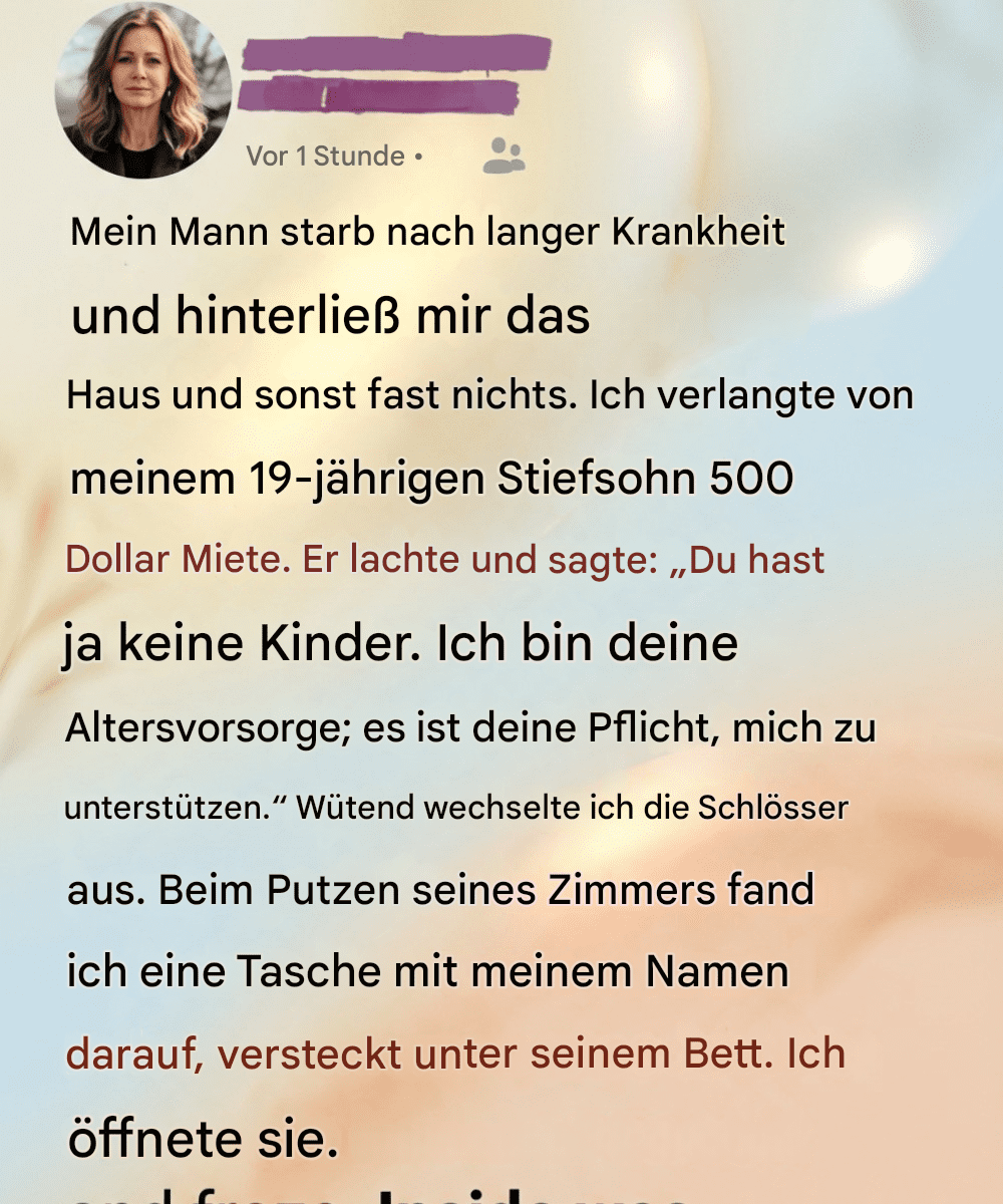 Als ich sein Zimmer aufräumte, bemerkte ich eine Reisetasche unter dem Bett, auf der mein Name ordentlich geschrieben stand. Neugierig und verwirrt öffnete ich sie. Darin befand sich ein Sparbuch, gefüllt mit Aufzeichnungen über kleine, aber regelmäßige Einzahlungen aus mehreren Jahren. Darunter lag eine gefaltete Geburtstagskarte, geschrieben in Leos sorgfältiger Handschrift. In der Karte erklärte er, dass er heimlich gespart hatte, um mich nach dem Tod seines Vaters bei der Pflege zu unterstützen. Seine scherzhafte Antwort am Vorabend, schrieb er, sei sein unbeholfener Versuch gewesen, seinen Plan zu verbergen, bis er den richtigen Zeitpunkt gekommen sah. Während ich las, verschwammen die Worte vor meinen Augen. Mir wurde bewusst, wie sehr Schmerz und Angst meine Sichtweise verzerrt hatten und wie sehr er sich Gedanken um meine Zukunft gemacht hatte.